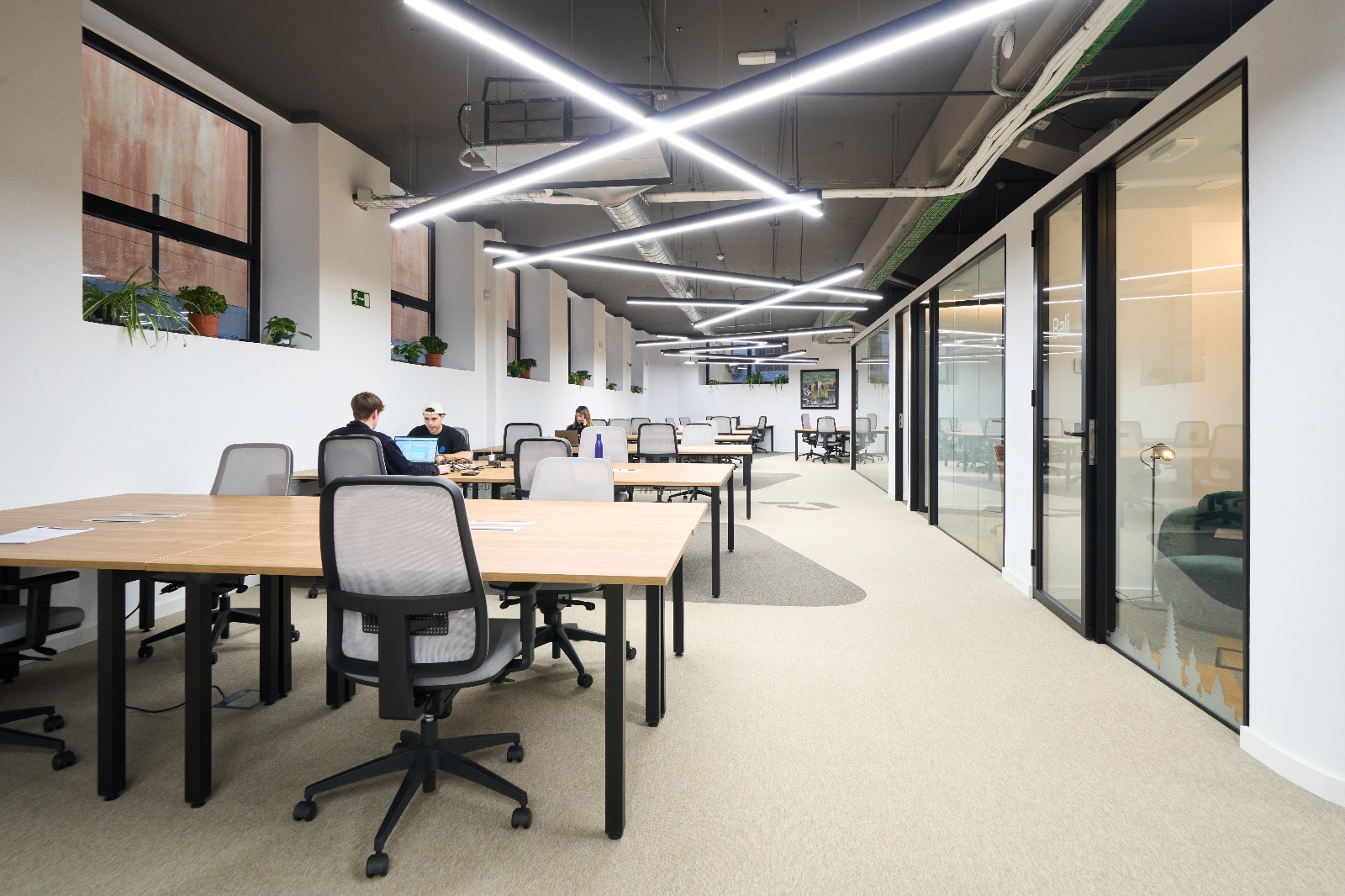 La zona de Open Plan destaca por su amplitud y una iluminación técnica de diseño lineal que recorre los techos industriales, aportando un aire vanguardista y dinámico. El mobiliario se ha seleccionado bajo criterios de ergonomía y funcionalidad, utilizando maderas claras y tonos neutros para mantener un ambiente despejado y profesional. Las estructuras curvas de las salas de reuniones rompen la linealidad del espacio, aportando fluidez y un diseño orgánico único.