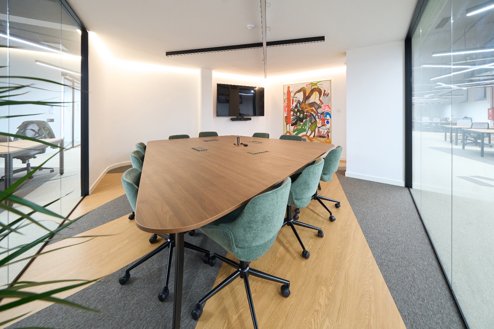 Las salas de reuniones y despachos se han concebido con una estética diferenciada: desde grandes mesas triangulares para sesiones de estrategia hasta espacios más íntimos con toques de color y arte vibrante que estimulan la creatividad. El uso de cerramientos de vidrio con perfiles negros permite que la luz natural inunde todas las estancias, manteniendo la conexión visual entre los distintos departamentos.